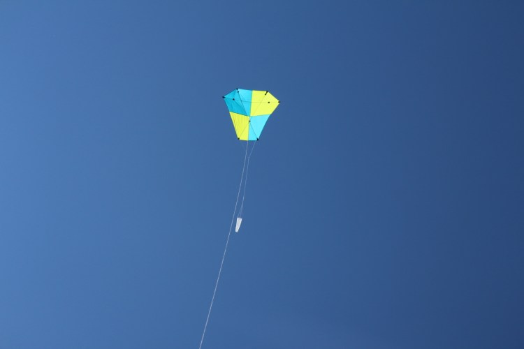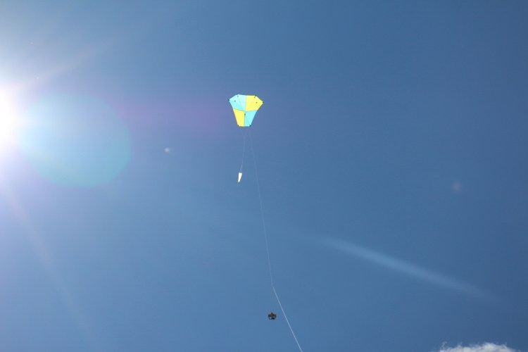 This is a big kite, standing over seven feet tall and over eight feet wide, with a sail area of 41 square feet (almost 4 square meters), nearly twice that of the Mini Dopero. It is also light, weighing in at 18 ounces, only 5 more than the Mini Dopero. That combination of big and light should allow it to lift a rig in a very light breeze. If you want to read more about the kite itself, including tips and links to get you started on building one, see this page.