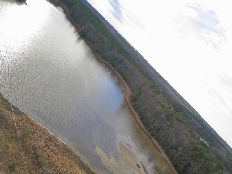 The camera was pointed north to take pictures along the shore. The first picture in the gallery above has the Naval Air Station in view off in the distance. There is a pattern of sandbars just under the surface that run parallel to the shore and were not visible from the ground. Five or six of them can be seen, and they seem to be fairly evenly spaced, the last one being probably a few hundred feet away from the beach. I don’t know if these are unique, but I thought they were quite beautiful and interesting. The second picture looks a little bit more inland, where a small pond and a house are visible. That is actually the second of two adjacent ponds, the first one being Biscoe Pond, which was right behind me. (Google Maps doesn’t give the second pond a name.) Since the camera wasn’t pointed at it, the only time I got a picture of Biscoe Pond was when a gust swung the kite and camera around. It came out very tilted, but anyway it gives an idea of the size and shape…