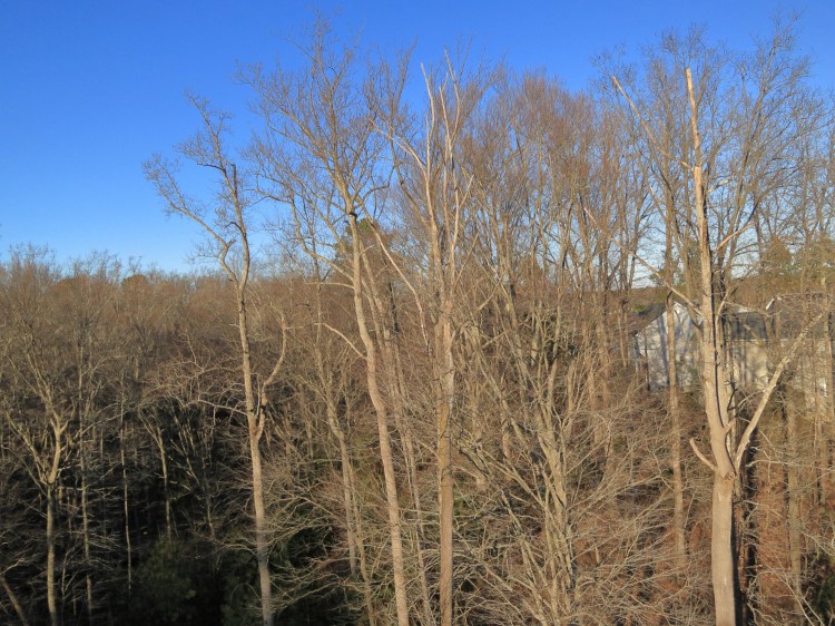 I realized, though, that my chances successful kite flying are significantly improved during the winter. Since the trees have lost their leaves, wind is able to pass through much more easily than during the summer. If the breeze is in the right direction, it can result in wind near ground level that is steady enough to launch a kite and get it above the trees.