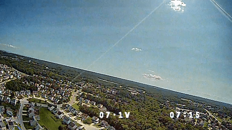 The gusty behavior resulted in images captured over just about 180 degrees of view with the fixed rig, which I see as a benefit. Some of the best shots are shown above. The quality is definitely much better than the FPV camera, of course, and they show off some of the prominent features of the area. The most noticeable feature is the big white tower off to the east. Interestingly, I never even noticed this tower until I first started flying my R/C planes around with cameras attached. It’s very prominent from the air but somewhat obscured from the ground. That’s just one example aerial views really give a different and unique perspective. Farther to the east, the control tower for the Patuxent River Naval Air Station is visible miles away. There is a small pond in the neighborhood in the first image looking towards the north, a larger one in the last image towards the south, and an even larger one beyond the neighborhood farther to the south. I even got one good shot of the flying site from above: