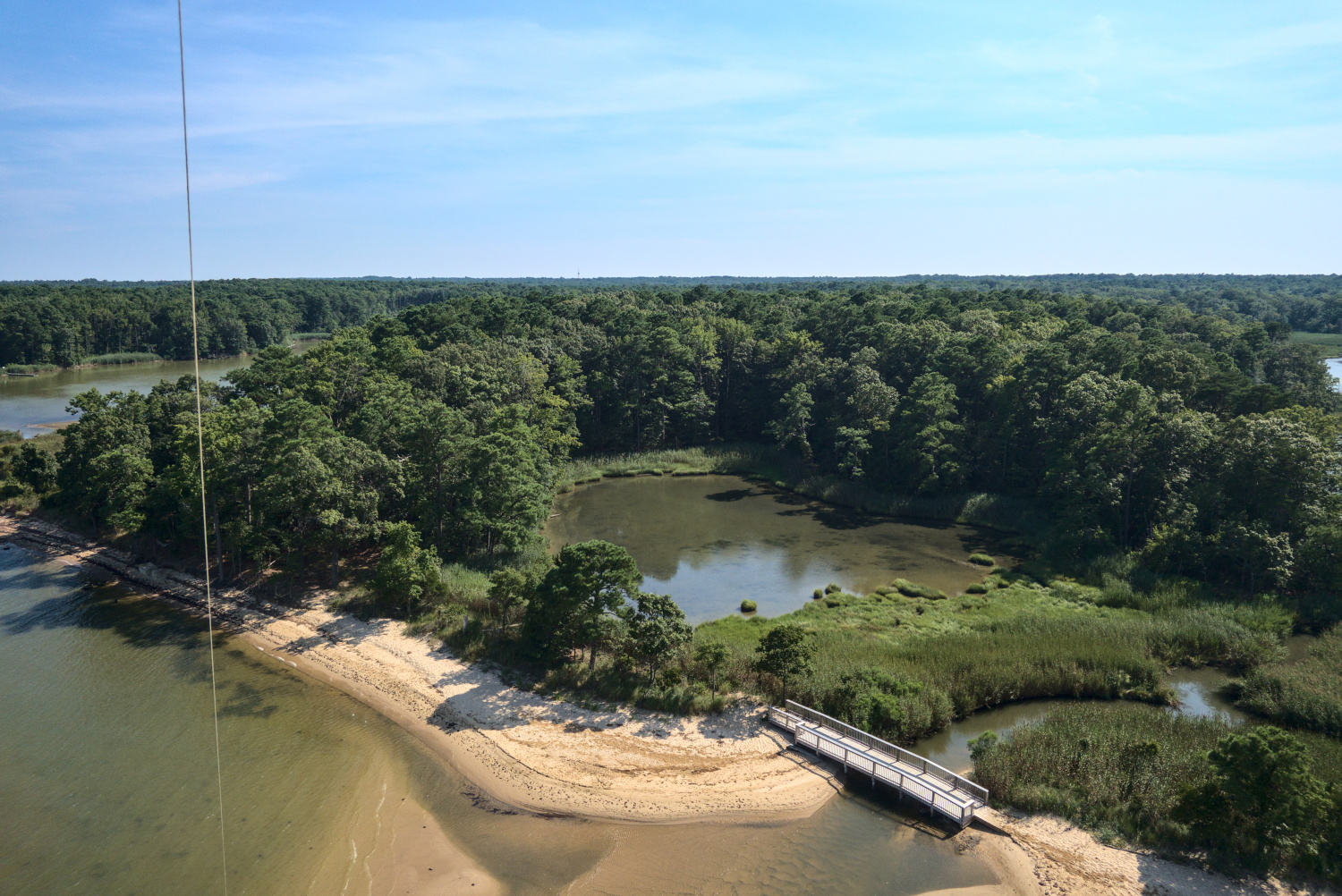 Once the kite was flying higher, I started walking down the beach to take shots from different perspectives. I ended up crossing a small stream where a pond empties into the bay (visible in the photo at the top of this page) and walking further down. A few hundred feet offshore, dozens of wooden posts stick up out of the water, which are very popular roosting spots for birds, as you might imagine. Ospreys, seagulls, pelicans, and even eagles enjoy resting on these posts. In an effort to get some pictures of these posts with my kite, I waded as far as I could out onto a small, mostly submerged sandbar.