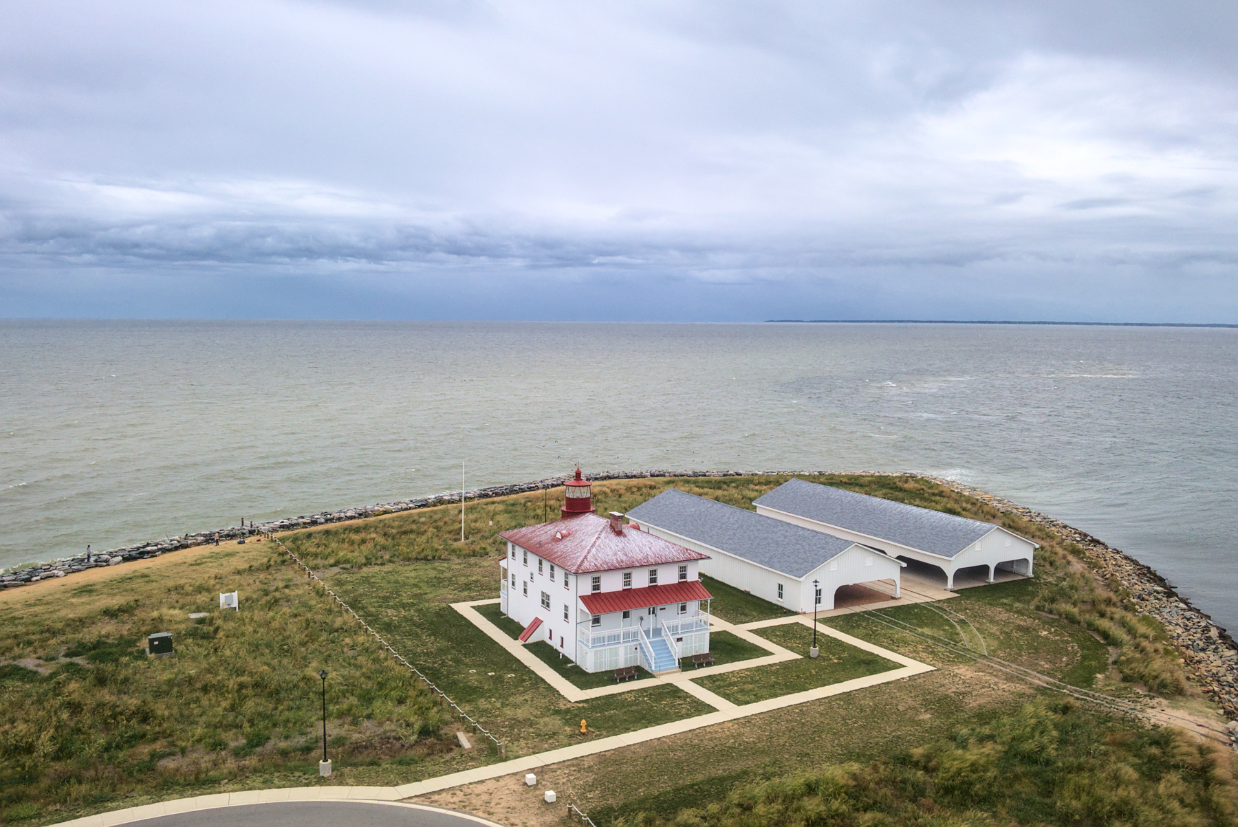 The weather has not cooperated with my schedule to do much KAP lately. Today, the forecast was overcast with a chance of rain all day, but there was finally some wind in a direction suitable for taking aerial photos of the Point Lookout Lighthouse, so I decided to head over there and see what would happen. Overcast can be good, because it avoids the harsh highlights and shadows of bright daylight and can also produce dramatic-looking clouds sometimes.