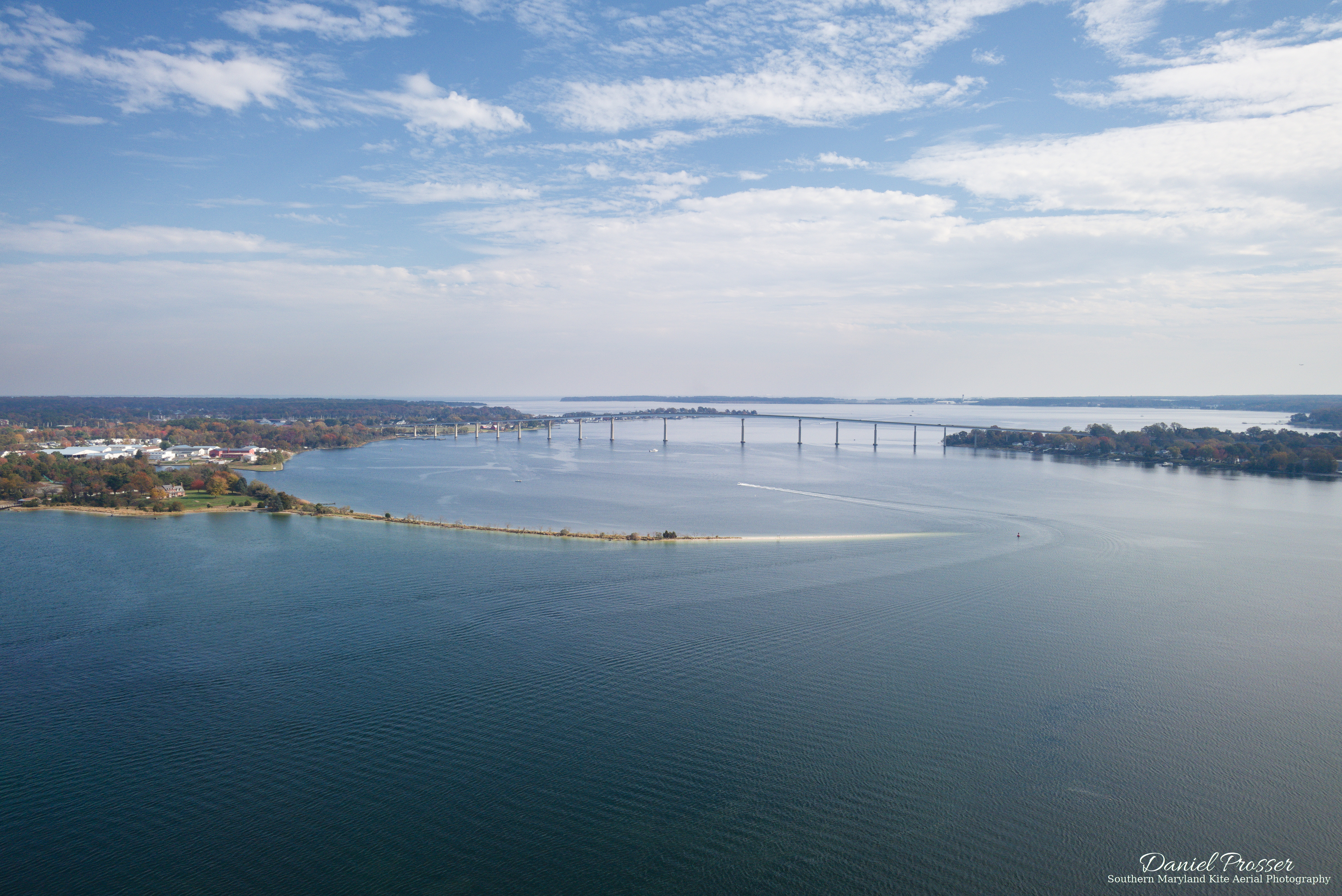 This time, the wind remained steady for about 15 minutes, giving me just enough time to release most of my line and snap some pictures. Since I had been here before, I knew that the view towards the bridge was the best, so I didn’t bother trying to take any others. There ended up not being enough time anyway, because the wind died once again, forcing me to end the session. The rig landed in the sand a second time, this time tangling the two lines hopelessly together. I didn’t mind, since I was happy to beat my own expectations and get a very nice kite aerial photo of Southern Maryland in fall colors and soft November light. I have had plenty of unsuccessful KAP sessions, but this time persistence paid off!