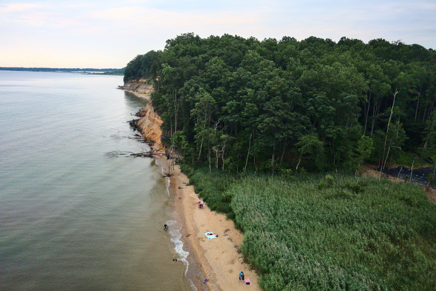 Calvert Cliffs State Park: a place I’ve been meaning to go since I first came to Southern Maryland for an interview more than six years ago. I finally went there for the first time last Friday, June 18, when I came along with my daughter for a school trip. The site has a small beach surrounded by cliffs, and there is a two-mile hike to get there from the parking area (two miles is the minimum; you can also take longer hikes on other trails). I had considered trying to do kite aerial photography at Calvert Cliffs before, but having never been there, I didn’t know if the small beach would be suitable for launching a big kite. But while I was there on Friday, it seemed like it should be possible if the wind came from just the right direction.