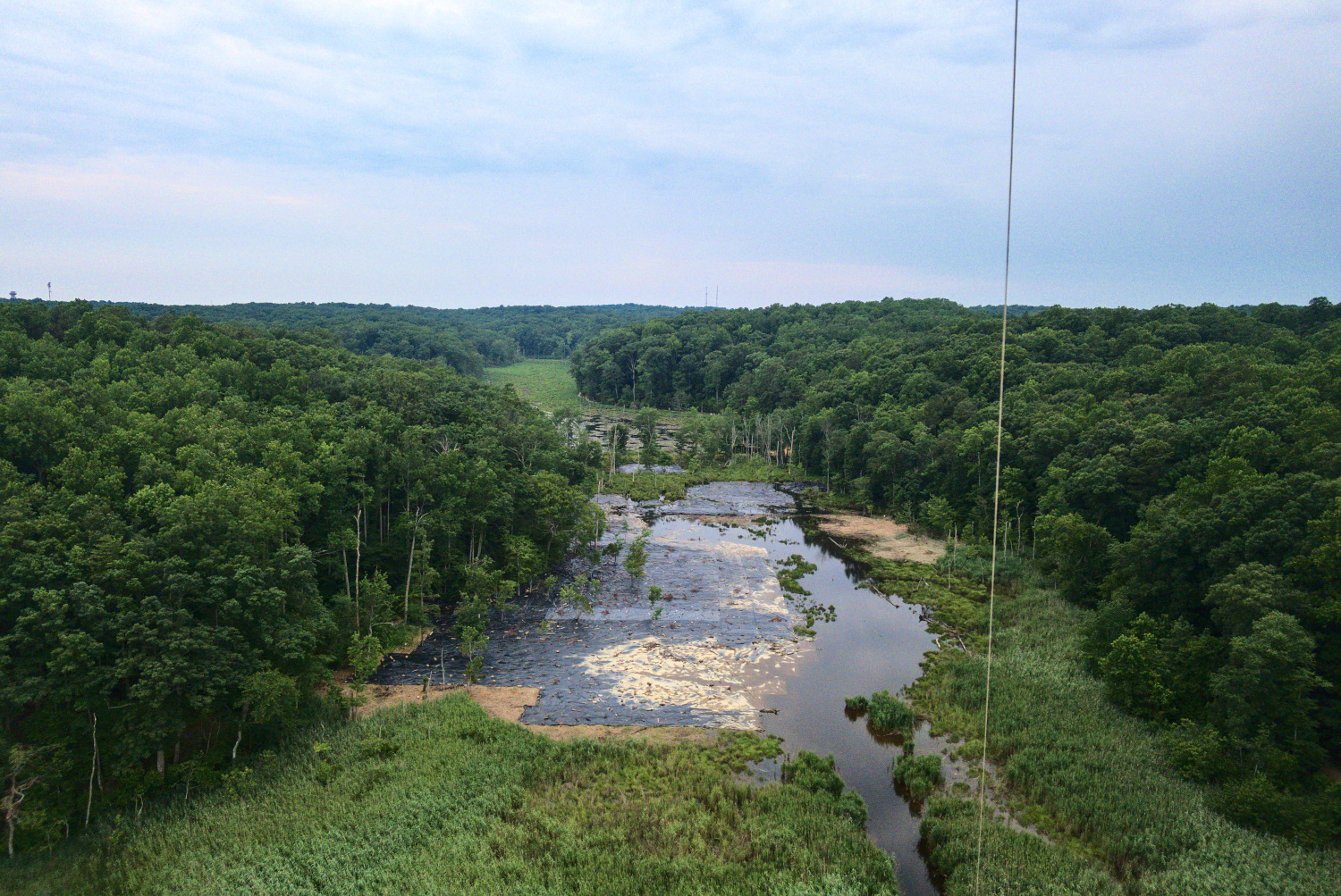 Wetlands near Calvert Cliffs. The black tarps are to control an invasive species of grass in the wetlands.