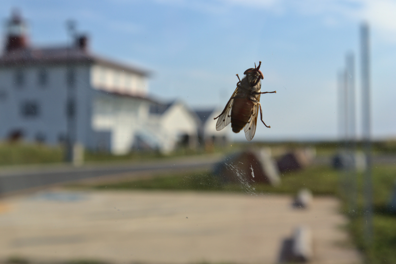 After the session, I drove down to the end of the peninsula to check it out. The last time I came to Point Lookout, the very end was closed due to lighthouse renovations, so I wanted to see if it was open again. It turns out that it was. I’ve been wanting to do some KAP of this place, so I’ll put it on my mental KAP to-do list. I think it will look good from a couple hundred feet high with the camera offshore past the end of the peninsula. Here’s a picture of the lighthouse that I took from the ground, and also, just for fun, a picture of the big fly that landed on my window (these things are all over the place at Point Lookout, and they seem to love cars).